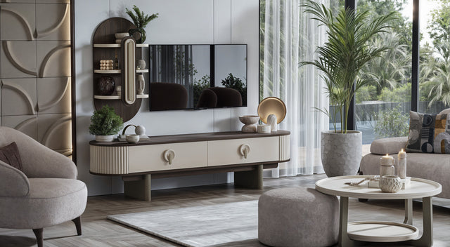 - Spacious Lower Console - 215 cm wide surface provides ample room for your TV, gaming consoles, soundbar, and decorative items