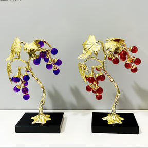 These stunning grapevine decor pieces from Meeshan Furniture are a captivating blend of nature-inspired design and sophisticated craftsmanship. Each piece features a beautifully sculpted, gold-toned metallic vine with intricate leaves that seem to shimmer. The branches are adorned with clusters of "grapes" made from polished, translucent stones—one with deep amethyst-purple hues and the other with rich, ruby-red tones. Both pieces rest on a sleek, black rectangular base, providing a modern and stable foundation. This decor brings a touch of luxury and artistic flair to any space, perfect for adding a pop of color and texture to a bookshelf, mantel, or side table.