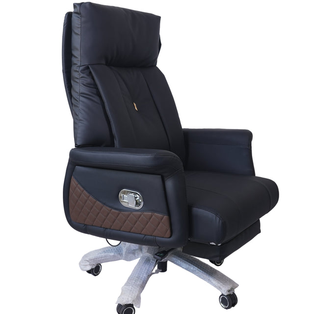 The Rolles CEO Executive Chair is a statement piece designed for both commanding presence and superior comfort. The chair's most striking feature is its two-tone upholstery, featuring a rich, dark brown or tan-brown leather-like material on the seat and backrest, contrasted with a sophisticated black frame and accents. It has a high back with a prominent headrest, offering full support for the user. The chair is distinguished by its heavy-duty, five-pointed rolling base, which ensures stability and mobility. The generously padded armrests and a thick seat cushion with a waterfall edge provide excellent ergonomic support for long hours of work. The design is a perfect blend of classic executive style with a modern, streamlined aesthetic, making it an ideal centerpiece for any high-end office or study.