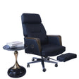 The Texla CEO Executive Chair is a sophisticated and highly functional seating solution designed for the modern office. It is upholstered in a rich, black leather-like material with distinct brown, diamond-quilted accents on the sides of the seat and backrest. The chair features an exceptionally high back, a wide headrest, and thick, contoured padding, which provides comprehensive support and comfort. A unique aspect of the chair's design is its heavy-duty, five-pointed rolling base, which ensures stability and mobility. The chair also has padded armrests with integrated chrome-finished controls, and a prominent side lever for recline adjustment, making it ideal for both long working hours and moments of rest.